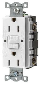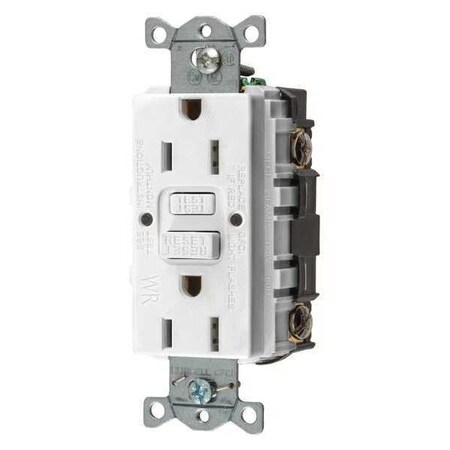 - <b>Price For:</b> Each <b>Number of Poles</b>: 2 <b>Amps</b>: 15A <b>Tamper Resistant</b>: No <b>Reset Type</b>: Manual <b>Outlet Type</b>: Decorator <b>Voltage</b>: 125VAC <b>HP</b>: 0.5 <b>Item</b>: GFCI Receptacle <b>Special Features</b>: Ground Fault Indicator <b>Power Indicator</b>: Yes <b>Self-Testing</b>: Yes <b>Standards</b>: UL listed, CSA certified <b>Mounting Type</b>: Flush <b>Weather Resistant</b>: Yes <b>Color</b>: white <b>Number of Wires</b>: 3
