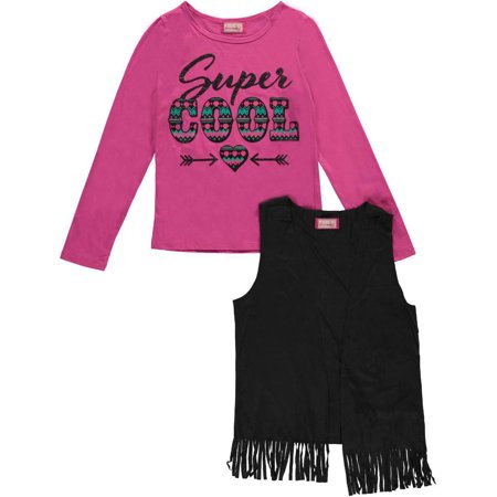 She'll love the fringed vest and graphic top of this Dream Star combo! Dream Star long-sleeved top with vest Jersey long-sleeved top with glitter graphic (60% cotton, 40% polyester) Faux suede vest with fringed hem (92% polyester, 8% spandex) Machine wash cold, inside out Imported