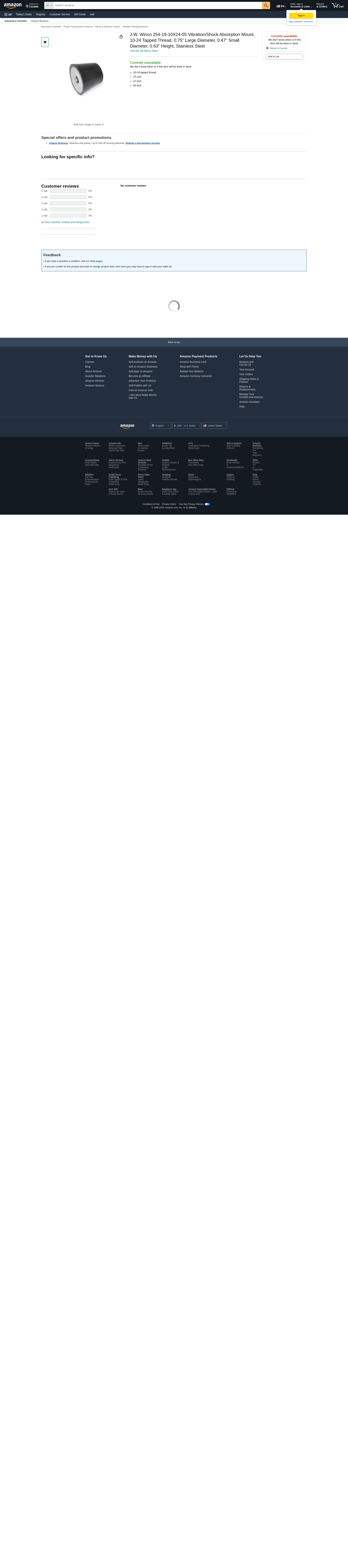 J.W. Winco 254-19-10X24-55 Vibration/Shock Absorption Mount, 10-24 Tapped Thread, 0.75" Large Diameter, 0.47" Small Diameter, 0.63" Height, Stainless Steel