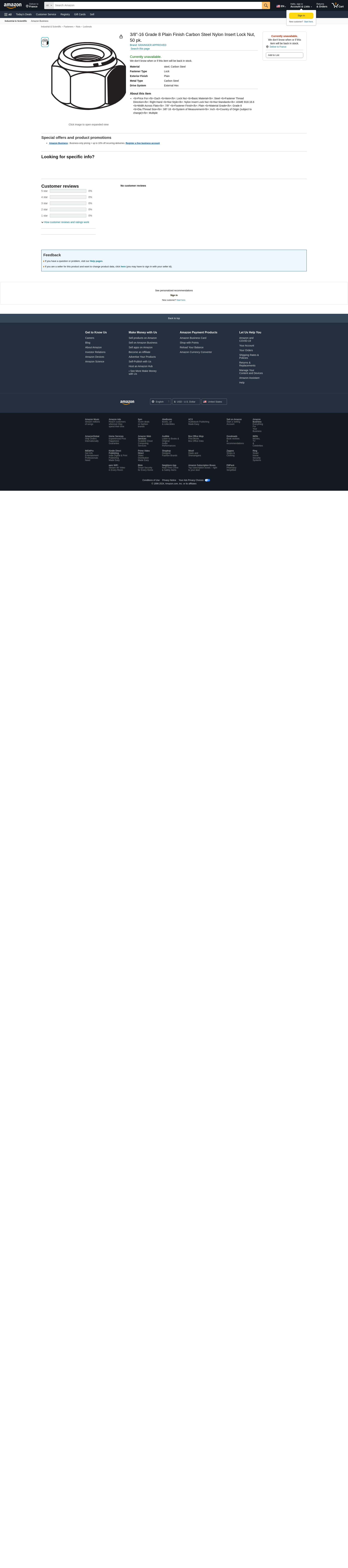 'Lock Nut, Nut Style Nylon Insert Lock Nut, System of Measurement Inch, Carbon Steel, Fastener Finish Plain, Fastener Thread Direction Right Hand, Fastener Thread Type UNC, Dia./Thread Size 3/8 In.-16, Material Grade Grade 8, Width Across Flats 7/8 In., Nut Height 21/32 In., Nut Standards ASME B18.16.6, Package Quantity 50'