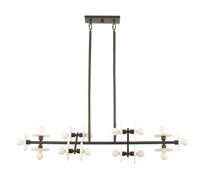 Discs of alabaster stone take center stage in the otherwise subdued design of the Savoy House Amani 14-light linear chandelier. The natural beauty of the alabaster is offset by a lovely matte black finish, creating a look that pops. Amani is 10.125" in height, 48" in length and 10" in width. It uses 14 standard size bulbs of up to 60 watts each (bulbs not included). Comes with eight 12" downrods and two 6" downrods.