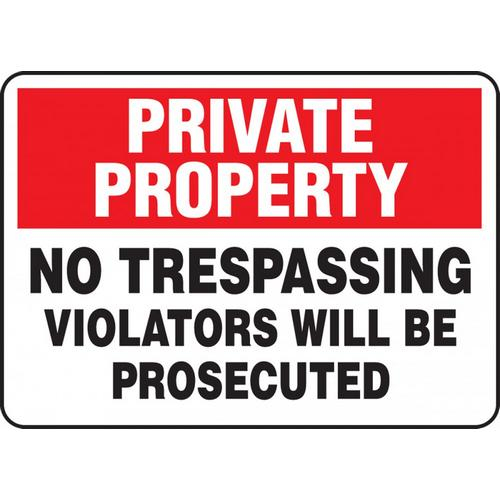 Accuform MATR960VS, 7" x 10" Adhesive Vinyl Sign with Legend: "No Trespassing Violators Will Be Prosecuted" Inform others that they're approaching private property where trespassing is prohibited. Clearly label private property and restrict access Inform trespassers they will be prosecuted Adhesive Vinyl (VS) - Self-stick custom signs. Adhesive Vinyl is a moisture-resistant custom sign material that adheres to almost any flat surface. Adhesive vinyl signs will work for short term outdoor applications, and in moderate temperatures.
