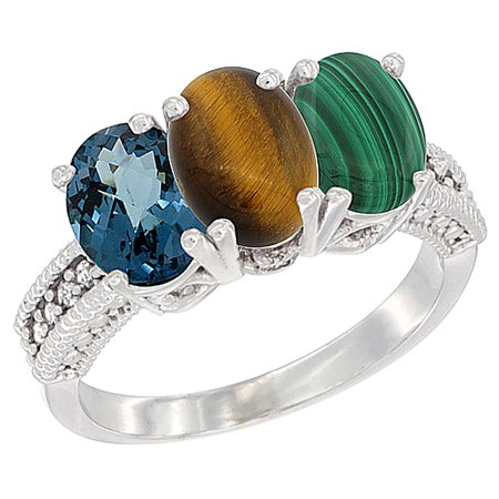 14K White Gold Natural London Blue Topaz, Tiger Eye & Malachite Ring 3-Stone 7x5 mm Oval Diamond Accent, sizes 5 - 10