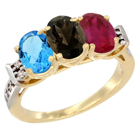 10K Yellow Gold Natural Swiss Blue Topaz, Smoky Topaz & Enhanced Ruby Ring 3-Stone Oval 7x5 mm Diamond Accent, sizes 5 - 10