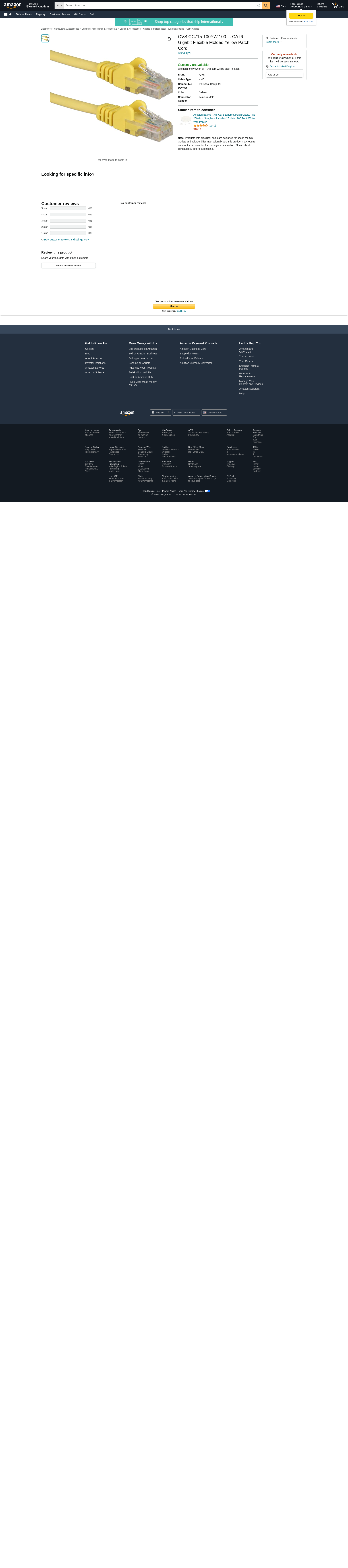 QVS CC715-100YW 100 ft. CAT6 Gigabit Flexible Molded Yellow Patch Cord