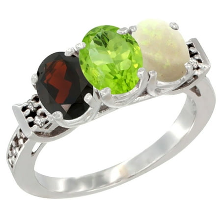 10K White Gold Natural Garnet, Peridot & Opal Ring 3-Stone Oval 7x5 mm Diamond Accent, sizes 5 - 10