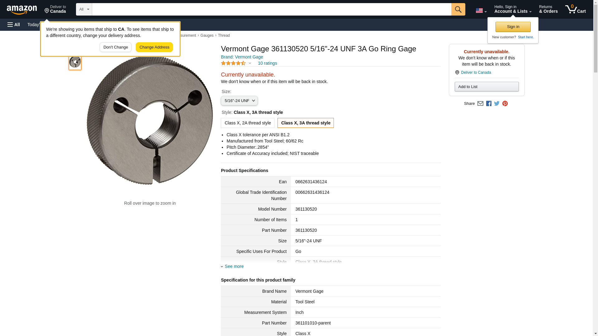 Vermont Gage 361130520 5/16"-24 UNF 3A Go Ring Gage