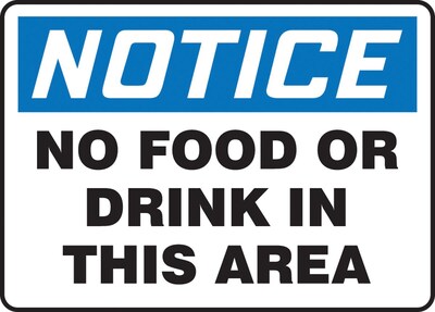 Accuform, MHSK838VS, 10" x 14" OSHA Notice Safety Sign "No Food Or Drink In This Area" Adhesive Vinyl Features: Flexible, pressure-sensitive adhesive vinyl For indoor and short-term outdoor applications Conforms to smooth curved surfaces