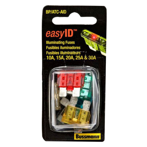 Bussmann Automotive Blade Fuse Kit includes common replacement fuses for automobiles, light- and heavy-duty trucks, buses, etc., all packed in a compact, reclosable, see-through package.<br /><br /> Kit Type: Automotive Blade Fuse Kit<br /> Item: Fuse Kit<br /> Total Number of Fuses Included: 5<br /> Fuse Series Included: ATC<br /> Fuse Kit Contents: (1) Easy ID Illuminating ATM 10, 15, 20, 25, 30<br /> Kit Fuse Class: No Fuse Class