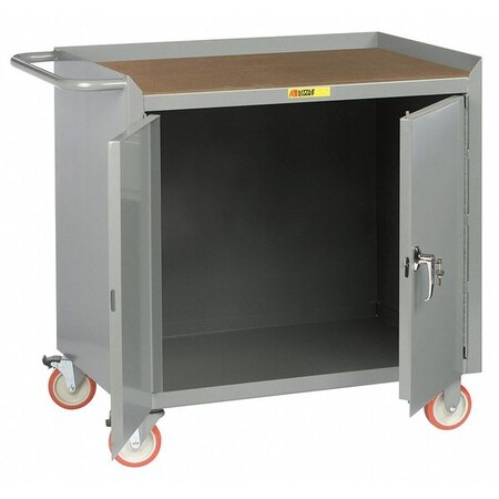MCH-2D-2436-TL Features: -Locking doors. -Top shelf has lip on three sides, with a flush front edge. -5" Non-marking polyurethane wheels with total lock brakes. -Capacity: 1200 lbs. -Top work surface material: 0.25" Hardboard. -Center shelf: No center shelf. Finish: -Gray. Weight Capacity: -1200 Pounds. Cabinets Included: -Yes. Country of Manufacture: -United States. Wheels Included: -Yes. Top Material: -Wood. Frame Material: -Metal. Dimensions: -Center & bottom shelves have 1.5" lip front edge. Overall Height - Top to Bottom: -38". Overall Width - Side to Side: -41.5". Overall Depth - Front to Back: -24". Overall Product Weight: -173 lbs.