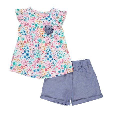 Bold colors and breezy style elevate this 2-piece from Teddyboom! <ul> <li>Teddyboom 2-piece outfit</li> <li>Jersey top with empire bodice, floral print, flutter sleeves, and chambray floral accent (100% cotton)</li> <li>Chambray shorts with elastic waistband and stitched cuffs (60% cotton, 40% polyester)</li> <li>Machine wash cold</li> <li>Imported</li> </ul>