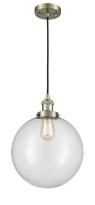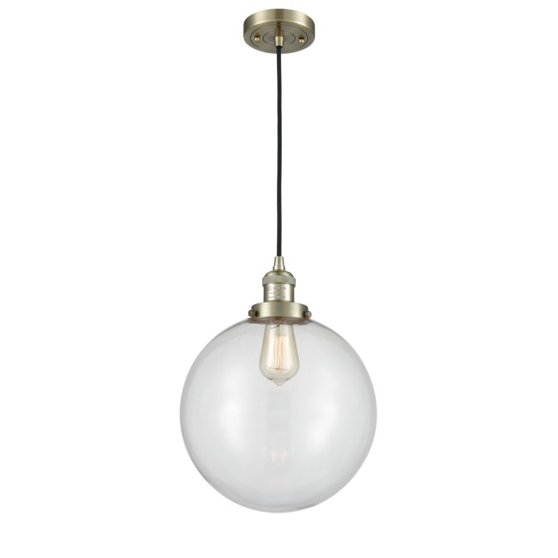 INNOVATIONS LIGHTING 201C-AB-G202-12-LED XX-Large Beacon 1 Light Mini Pendant part of the Franklin Restoration Collection. The XX-Large Beacon 1 Light Mini Pendant is part of the Franklin Restoration Collection. Includes 10 Feet Black Textured Cord. Collection: Franklin Restoration. Material: Steel, Cast Brass, Glass. Metal Finish(Body): Antique Brass. Metal Finish(Canopy/Backplate): Antique Brass. Dimension(in): 12(W) x 15(H) x 12(Dia). Minimum Height (Fixture Height with Shade, Cord or Included Stems & Canopy)(in): 19. Max Height (Fixture Height with Cord or Included Stems & Canopy)(in): 137. Wire/Cord: 10 Feet Of Black Textured Cord. Bulb: (1)3.5 Watt LED Vintage Medium Base Bulb Included,Dimmable. Color Temperature: 2700. Color Rendering Index(CRI): 82. Lumens): 350. Voltage: 120. Glass: Clear Beacon/Transparent. Shade Shape: Globe. Shade Material: Glass. Shade Size(in): 12 X 11.75. Shade Fitter Measurement: 3.25 inch Fitter. Canopy Dimension(in): 4.5 x 0.75. Solid Brass 90 Degree Hang Straight Swivel for Sloped Ceilings Included. UL/CUL Damp Rated. Warranty: 2 Year Finish, Lifetime Electrical.