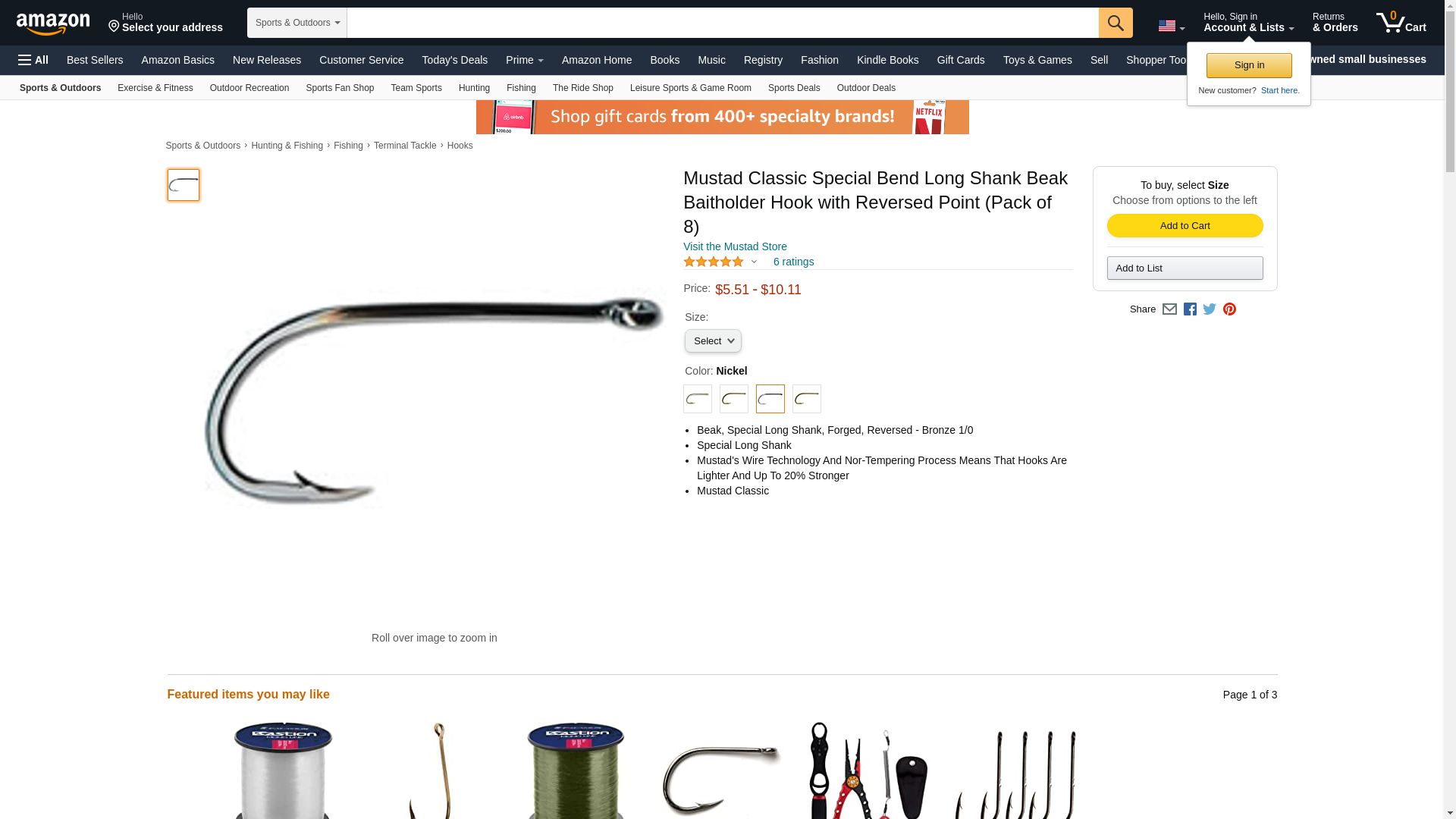 Mustad Classic Special Bend Long Shank Beak Baitholder Hook with Reversed Point (Pack of 8), Nickel, Size 4/0