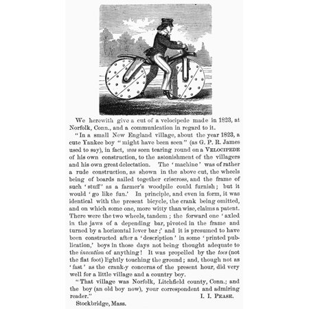 American Bicycle 1823 Na Bicycle Claimed To Have Been Constructed In 1823 By A Reader Of An American Magazine In Norfolk Connecticut During The Bicycle Craze Of 1869 Rolled Canvas Art - (24 x 36)