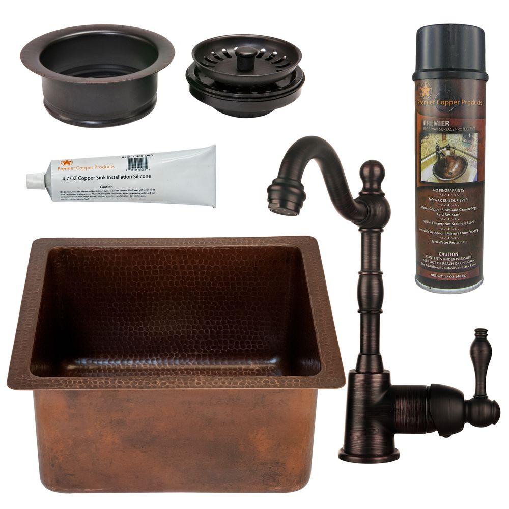 <p>Create a focal point for your bar or prep area as refreshing as the cocktails you will be preparing with a bar or prep sink from Premier Copper Products. Designed to suit your specific needs and style, handcrafted from pure copper by our skilled artisans, and built to last a lifetime, a bar or prep sink is the ultimate way to entertain and cook in style.</p><p><b>PACKAGE INCLUDES:</b></p><ul><li>16" Gourmet Rectangle Hammered Copper Bar/Prep Sink w/ 3.5" Drain Size (BREC16DB)</li><li>Faucet - Oil Rubbed Bronze (B-BV01ORB)</li><li>3.5"" Deluxe Garbage Disposal Drain w/ Basket - Oil Rubbed Bronze (D-130ORB)</li><li>Copper Sink Wax (W900-WAX)</li><li>Copper Sink Installation Silicone (C900-ORB)</li></ul><p><b>SINK PRODUCT DETAILS:</b></p><ul><li>Configuration: Rectangle</li><li>Design: Hammered Copper Surface</li><li>Color: Oil Rubbed Bronze</li><li>Outer Dimension: 16" x 14" x 8"</li><li>Inner Dimension: 14" x 12" x 8"</li><li>Installation Type: Under Counter or Surface-Mount</li><li>Rim: 1" Flat Rim</li><li>Countertop Depth Minimum: 17" Front to Back</li><li>Material Gauge: Industry Best (14 Gauge or .0625")</li><li>Drain Size: 3.5"</li><li>Faucet Mounting: Counter Deck Mount</li></ul><p><i>IMPORTANT NOTE: DUE TO THE HANDCRAFTED NATURE OF THIS PRODUCT SMALL VARIANCES IN SIZE AND COLOR MAY OCCUR.</i></p><p><b>FAUCET PRODUCT DETAILS:</b></p><ul><li>Overall Height: 11"</li><li>Spout Height: 8.25"</li><li>Spout Reach: 6"</li><li>Spout Swivel: 360 Degrees </li><li>Maximum Deck Thickness: 1.75"</li><li>Mounting Shank Length: 2"</li><li>Faucet Weight: 4.6 LBS</li><li>Flow Rate: 1.2 GPM @ 60 PSI</li><li>Valve Type: Ceramic Disc</li><li>Installation Type: Deck-Mount</li></ul><p><b>DRAIN PRODUCT DETAILS:</b></p><ul><li>Design: Deluxe Style w/ Strainer Basket</li><li>Outer Dimension: 4.5"</li><li>Inner Dimension: 3.5"</li><li>Material: Brass</li><li>Drain Size: 3.5"</li></ul>