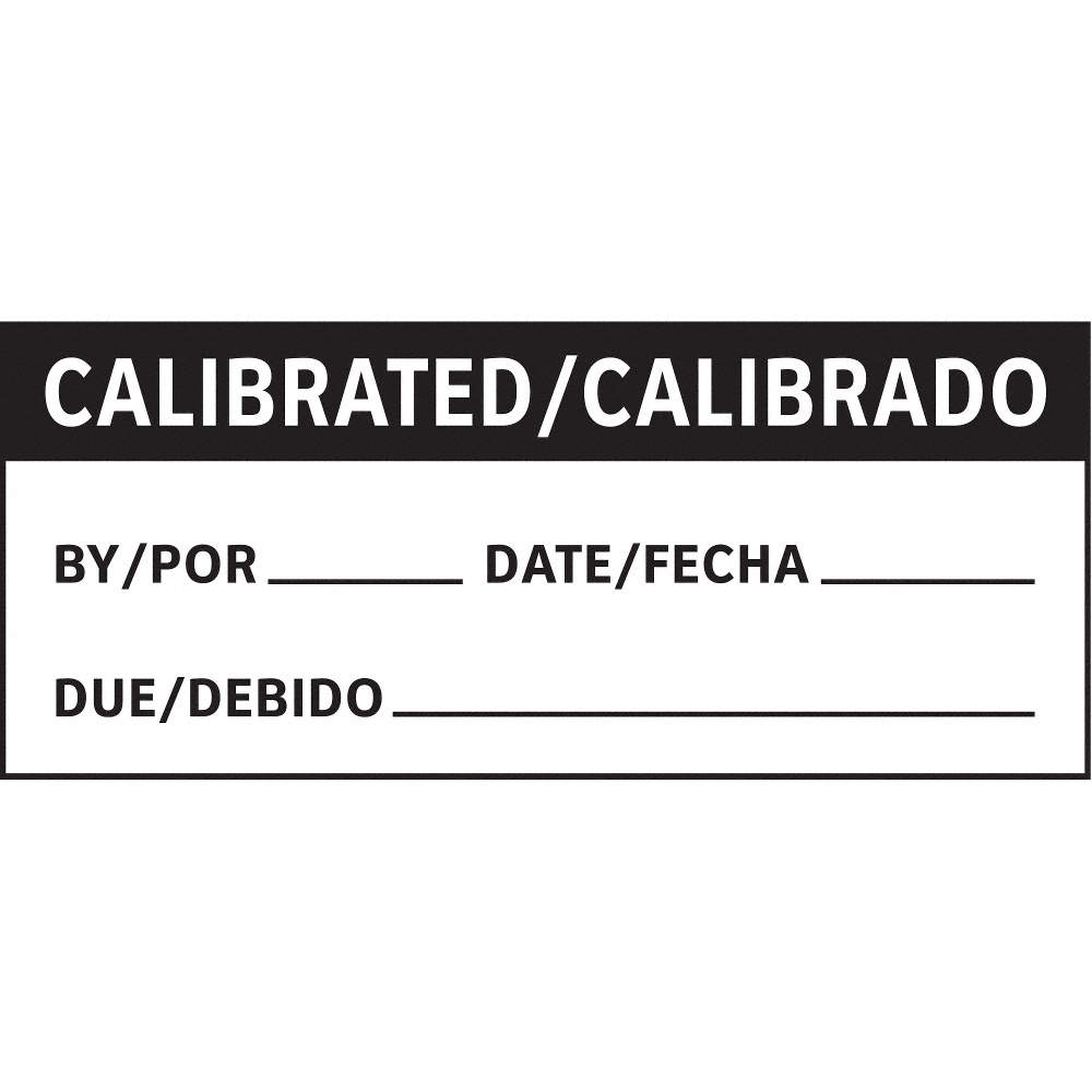 Calibration Label, Language Bilingual, Legend By/Por________Date/Fecha_______Due/Debido_______, Material Polyester, Height 1 in, Width 2 1/4 in, Header Calibrated/Calibrado, Write on Surface Yes, Self-Adhesive Yes, Package Quantity 225