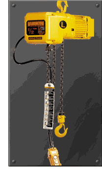The SNER Series for Harrington Electric Chain Hoist provides single phase operation in a heavy duty, low reach design. Features include extreme duty motor that exceeds ASME H4 rating, extremely durable and reliable traction motor brake, cast iron chain guide, fully sealed body, and grade 80 nickel-plated chain.