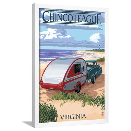 <ul> <li>Title: Chincoteague, Virginia - Retro Camper on Beach</li> <li>Artist: Lantern Press</li> <li>Paper Type: Art Print</li> <li>Product Type: Framed Art Print</li> <li>Framed in SOHO White</li> <li>Arrives ready-to-hang for fast, simple installation</li> <li>Framed Size: 22x32 in.</li> <li>Handcrafted in the USA</li> </ul>