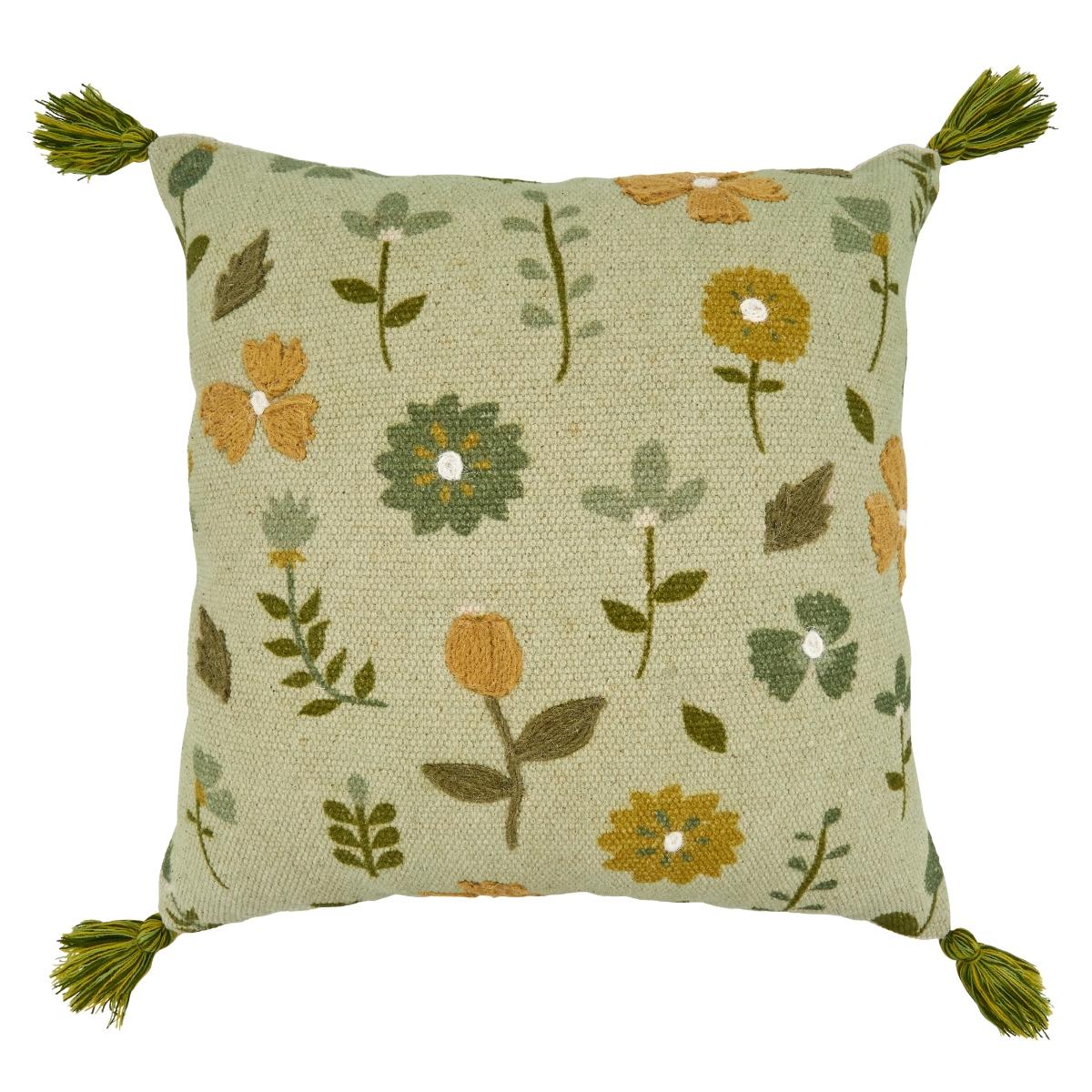 SARO 7103.G20SP 20 in. Square Poly Filled Throw Pillow with Green Embroidered Floral Design