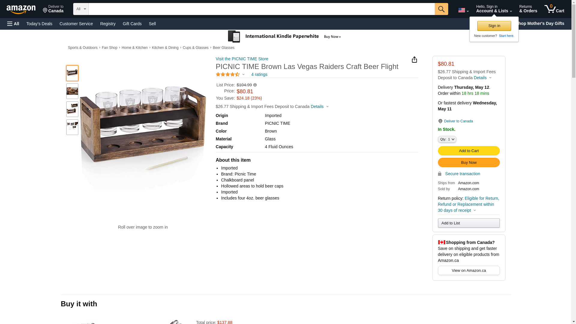 | Feature | NFL Picnic Time Craft Beer flight taster set with four 4-ounce glasses perfect for entertaining or the man cave |