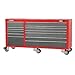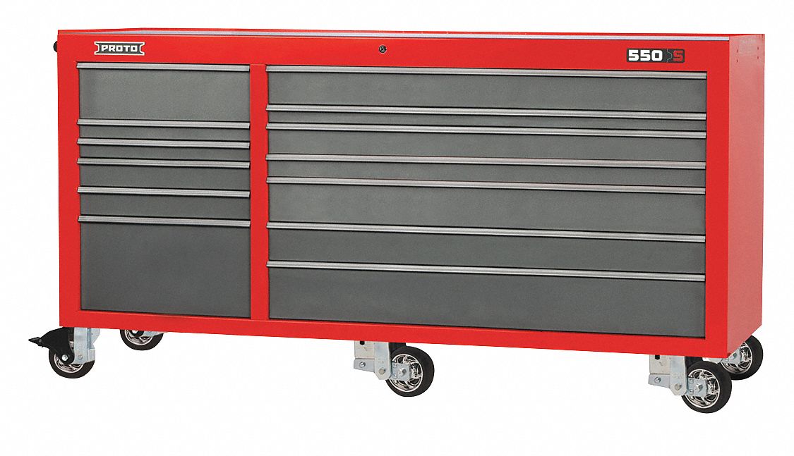Rolling Cabinet 550S Series Industrial Premium Width 88-1/4 In. Depth 27 In. Height 46-3/8 In. Number of Drawers 13 Red Drawer Color Gray Drawer Capacity 400 lb. Ball Bearing Full Extension Drawer Slides Gloss/Matte Finish Storage Capacity 48 517 cu in. Load Rating 3600 lb. Caster Size 6 in x 2 In. Number of Shelves 0 Steel Bottom 14 Side 16 Drawers 18 Gauge Work Surface Material Steel Vinyl Caster Wheel Material Glass Filled Nylon