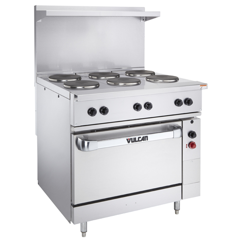 Vulcan EV36-S-6FP-208, Restaurant Range, 36", electric, (6) 2kw French hot plates 9 1/2" round French plates w/infinite controls, standard oversized oven w/(1) rack, stainless steel front, sides, single deck high shelf & 6" legs, 17.0kw, 208v