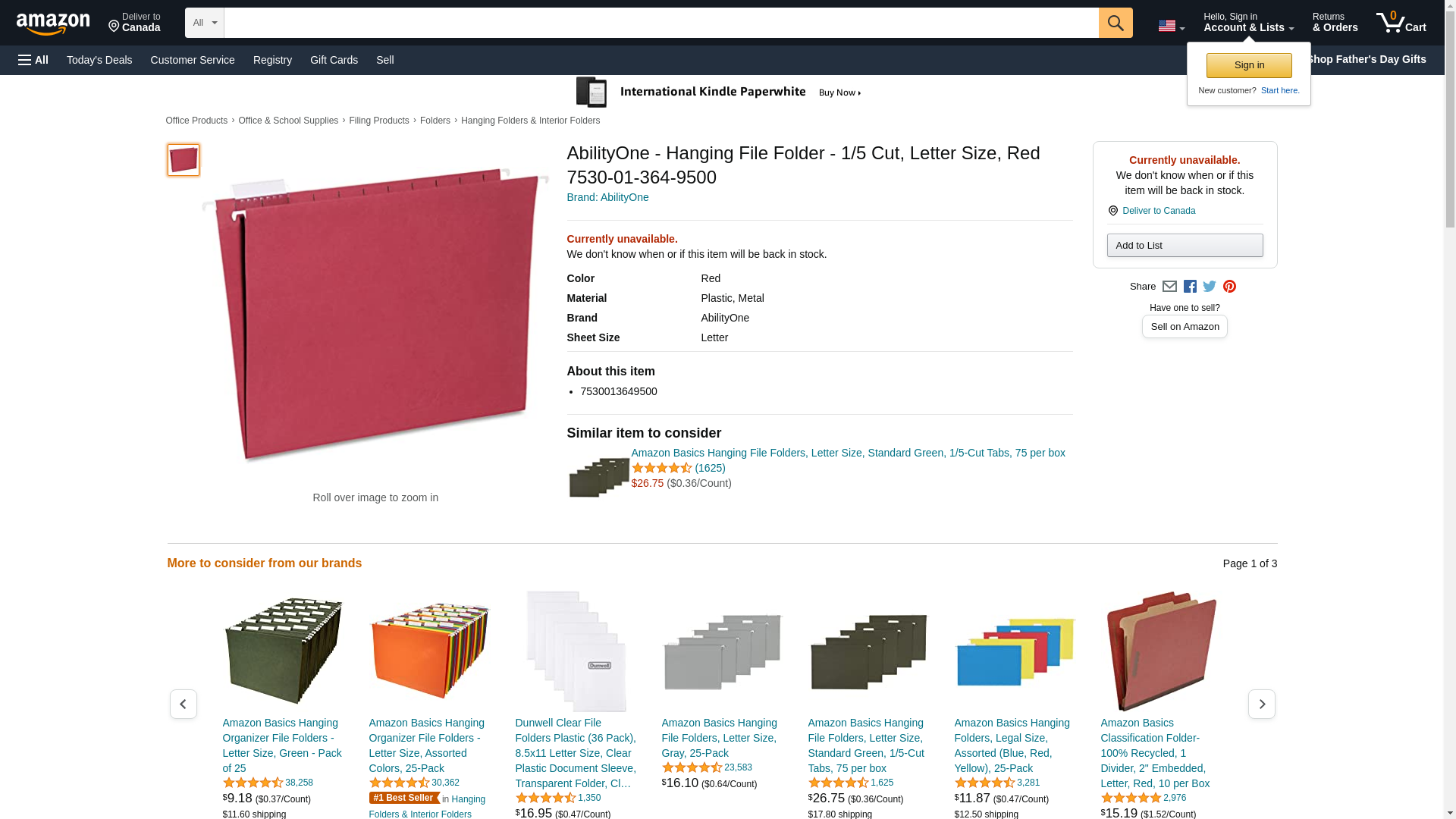 AbilityOne - Hanging File Folder - 1/5 Cut, Letter Size, Red 7530-01-364-9500, 7530-01-364-9500