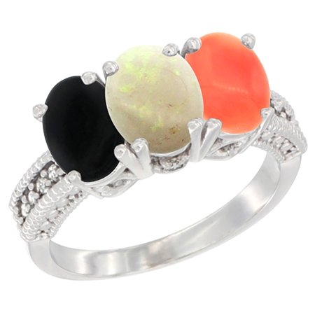 10K White Gold Diamond Natural Black Onyx, Opal & Coral Ring 3-Stone 7x5 mm Oval, sizes 5 - 10