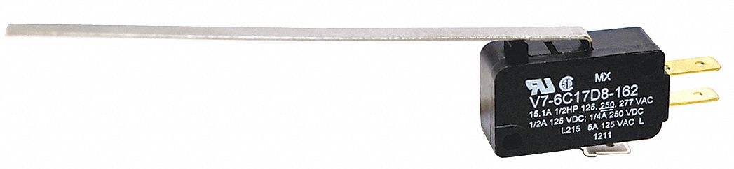 V7 Series Miniature Basic Switch, Single Pole Double Throw Circuitry, 15 A at 277 Vac, Straight Lever Actuator, 0,86 N [3.0 oz] Maximum Operating Force, Silver Contacts, Quick Connect Termination, CSA|UL