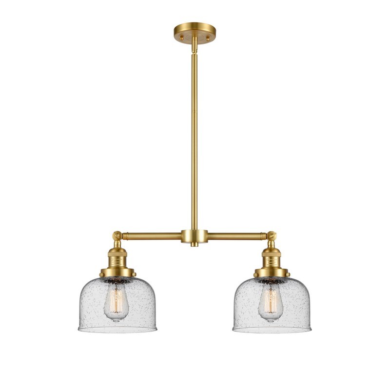 INNOVATIONS LIGHTING 209-SG-G74-LED FRANKLIN RESTORATION LARGE BELL 21 INCH TWO LIGHT SEEDY GLASS ISLAND LIGHT, SATIN...
