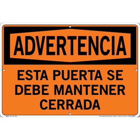 Vestil SI-W-67-D-AL-063-S THIS DOOR MUST BE KEPT CLOSED/ESTA PUERTA SE DEBE MANTENER CERRADA Warning Sign, Aluminum, 0.063" Overall Size, 18.5" W x 12.5" H