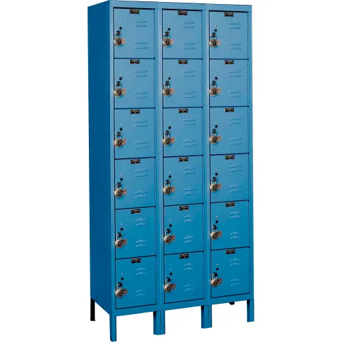 Hallowell Fully-assembled and ready to use right out of the box! ReadyBuilt lockers ship complete with a master-keyed controlled combination padlock for each locker door so lockers are ready to use the minute they arrive. Our multi-point gravity lift-type latching for wardrobe lockers assures a secure locker while box lockers offer a simple through-the-door finger pull single-point latch. All doors are louvered for ventilation and include a continuous piano hinge to insure a worry-free door operation. Wardrobe doors include a stainless steel recessed handle allowing the included padlock to sit fully-recessed into the door for added safety while reducing vandalism and improving overall locker appearance. Wardrobe lockers allow for larger personal storage while box lockers are perfect for storing of smaller personal items. Features: -Three wide six tier locker. -ReadyBuilt collection. -Marine blue color. -Prime cold rolled sheet steel construction. -Available in: -Small size. -Medium size. -Large size. . -18 Gauge louvered doors. -Projecting finger pull. -Single point through the door latching. -16 Gauge continuous piano hinge. Specifications: -Includes combination padlock with padlock strike plate. -No hooks included for box lockers. -Hallowell provides two years warranty. -Made in USA. -Leg dimension: 6" Height. -Small locker dimensions: 78" H x 36" W x 12" D. -Medium locker dimensions: 78" H x 36" W x 15" D. -Large locker dimensions: 78" H x 36" W x 18" D. URB3228-6A-MB / URB3258-6A-MB / URB3288-6A-MB Size: 78" H x 36" W x 15" D