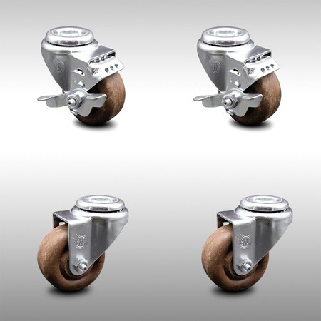 Stainless Steel High Temp Glass Filled Nylon Swivel Bolt Hole Caster Set of 4 w/3" x 1.25" Brown Wheels - Includes 2 with Top Locking Brakes - 1400 lbs Total Capacity - Service Caster Brand