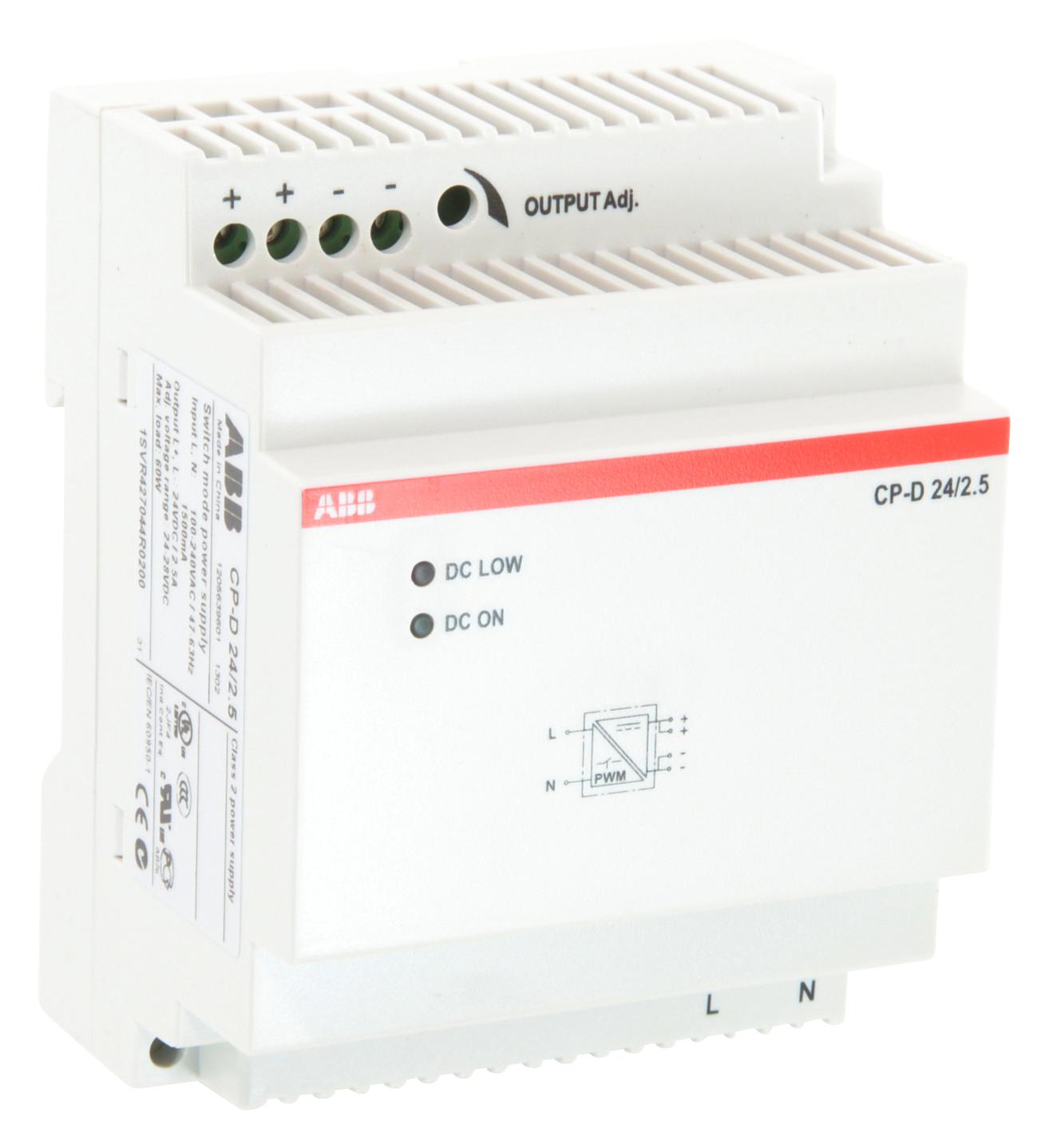 ABB CP-D switch mode power supply has 90 - 264 VAC/120 - 375 VDC input rating 24 VDC, 2.5 A output rating with a power output of 60 W. Brand Name|ABB#MFR Part Number|1SVR427044R0200#UPC|804325365246#UNSPSC|39121004#Item|Power Supply#Type|Switch Mode#Series|CP-D#Input Ratings|90 - 264 VAC/120 - 375 VDC#Output Ratings|24 VDC, 2.5 A#Power Output|60 W#Number of Phases|1#Dimensions|91 mm Height x 71 mm Width x 57.5 mm Depth#Standard/Approvals|CSA Certified, cULus Listed