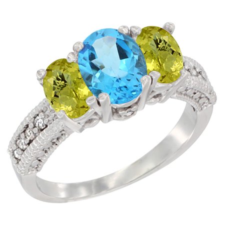 14K White Gold Diamond Natural Swiss Blue Topaz Ring Oval 3-stone with Lemon Quartz, sizes 5 - 10