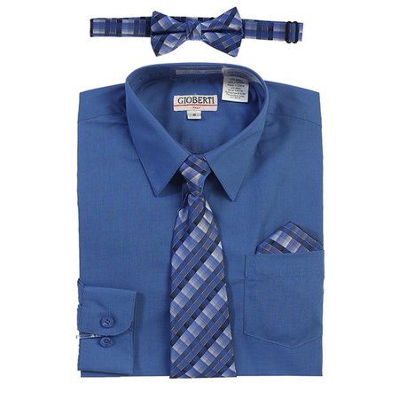 <ul> <li>Gioberti set for formal wear</li> <li>Long sleeved dress shirt in royal blue color with clip-on tie</li> <li>Pre-tied bow tie with clip-on adjustable band, and pocket square handkerchief</li> <li>Long Sleeve Dress Shirt: 60% Cotton, 40% Polyester</li> <li>Sizing is based on U.S. clothing size standards</li> </ul>