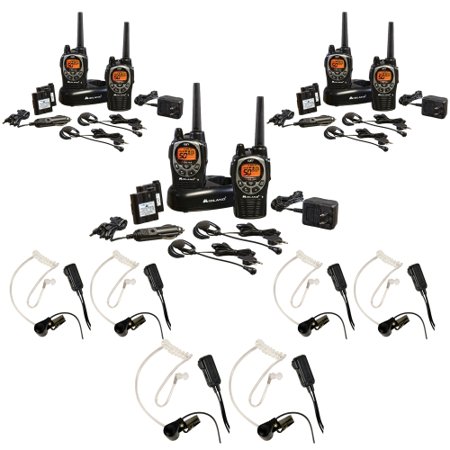 Midland GXT1000VP4 5 50 Channel Waterproof GMRS Radios with NOAA Weather/All Hazard Alert. Includes Rechargeable Batteries, Dual Desktop Charger, Headsets and 12 volt Vehicle Adapter, Pair Packed. The GXT1000VP4 features the standard 22 GMRS Channels plus an additional 28 Channels. The GXT1000 meets the JIS4 Standard of exposure to water for 30 minutes and features the Maximum Power allowed for GMRS Handheld Radios for up to a 36-Mile Range. Weather Scan finds the nearest NOAA broadcast to stay up to date with the latest weather and hazard information. <br /> <br />In addition to important weather announcements, All Hazards Alert means the GXT1000VP4 will receive other emergency announcements such as Child Abduction (Amber Alert), Nuclear Power Plant Warnings, Biological Hazard, Fire, and Landslide Warnings. New features for 2009 include the Whisper feature which allows you to speak quietly and still be heard clearly by others and SOS to send out a distress sound for emergency situations. The Group Call allows you to make "direct calls" to other people within the group without alerting the entire group. The GXT1000VP4 features a Vibrating Alert for silent notification and 9 Level E Vox for Hands Free operation. Additional features are 142 Privacy Codes, Scan of the 50 Channels, Hi/Med/Low Power Settings, 10 Call Alerts, Keypad Lock, and Battery Save Circuit. Unlike other GMRS radios on the market that use lithium batteries, Midland's Dual Power Option allows the use of the included rechargeable batteries or 4 "AA" batteries (Not included). <br /> <br /> <br />Bundle includes: <br /> <br />3- Pairs of Midland GXT1000VP4 36-Mile 50-Channel FRS/GMRS Two-Way Radio <br /> <br />3- Pairs of Midland AVPH3 Transparent Security Headsets with PTT/VOX - Pair <br /> <br /> <br />