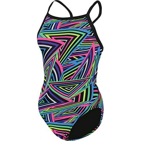 Bring a brilliant pattern to a practice or meet with the Dolfin Winners Presto women's swimsuit. It's constructed from a chlorine-resistant nylon/spandex fabric and features a V-2 back for a secure fit.