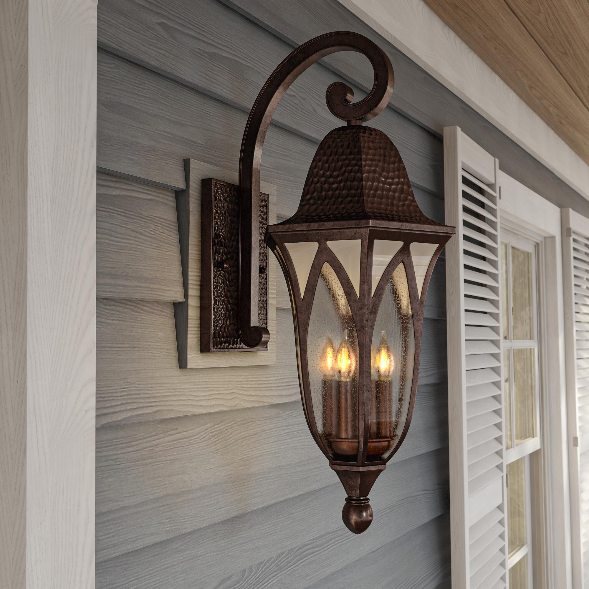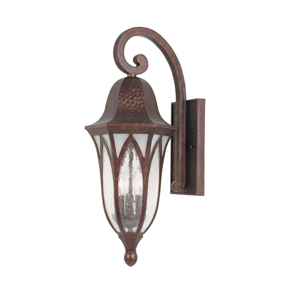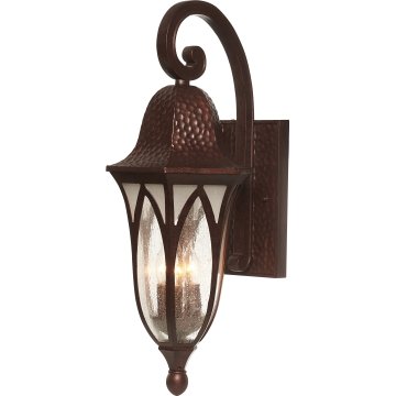 Timeless elegant styling and a gracefully fluted body, this collection features a boldly scrolled cast arm, vaulted arch style glass panels and a distressed hammered finish displaying a distinctive European influence. <table><tbody><tr><td> <ul><li>3 Light Outdoor Wall Sconce.</li> <li>Burnished Antique Copper finish.</li> <li>Clear Seedy and Etched Alabaster Style glass.</li> <li>.</li> </ul></td> </tr></tbody></table>
