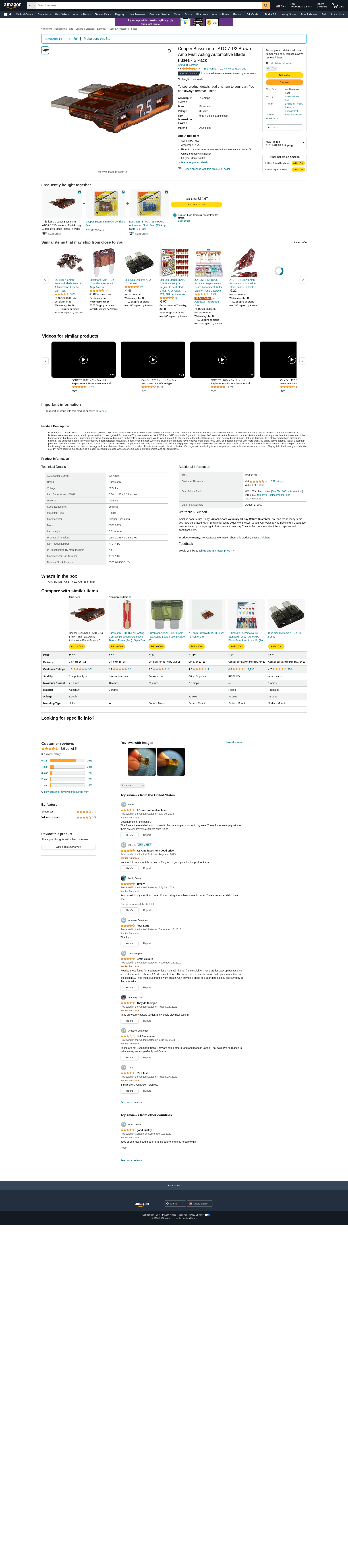 Bussman BP/ATC-7-1/2 RP 7-1/2 Amp Fuse 5 Count