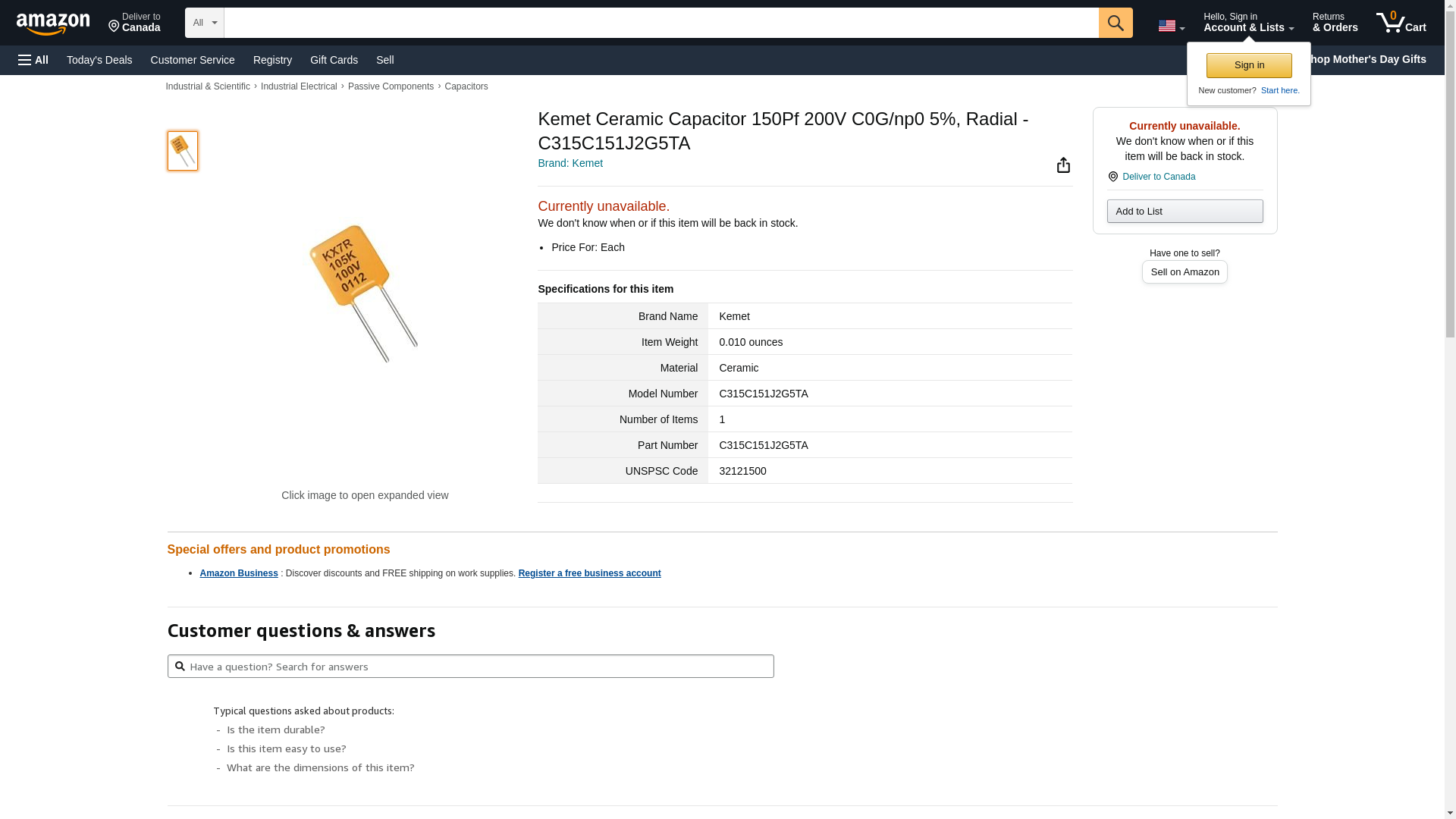 | Feature | This listing is for 2 pcs; Kemet Part Number: C315C151J2G5TA |