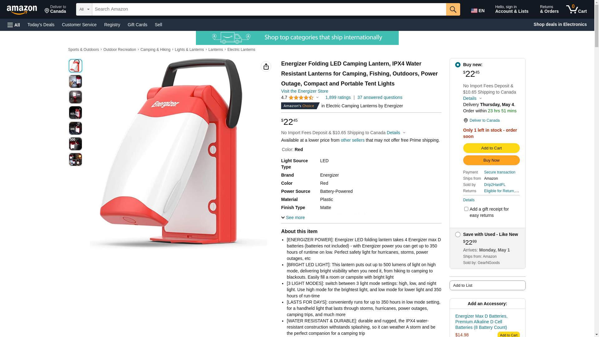 | Feature | ENERGIZER POWER: Energizer LED Folding Lantern takes 4 Energizer MAX D batteries (batteries not included) |