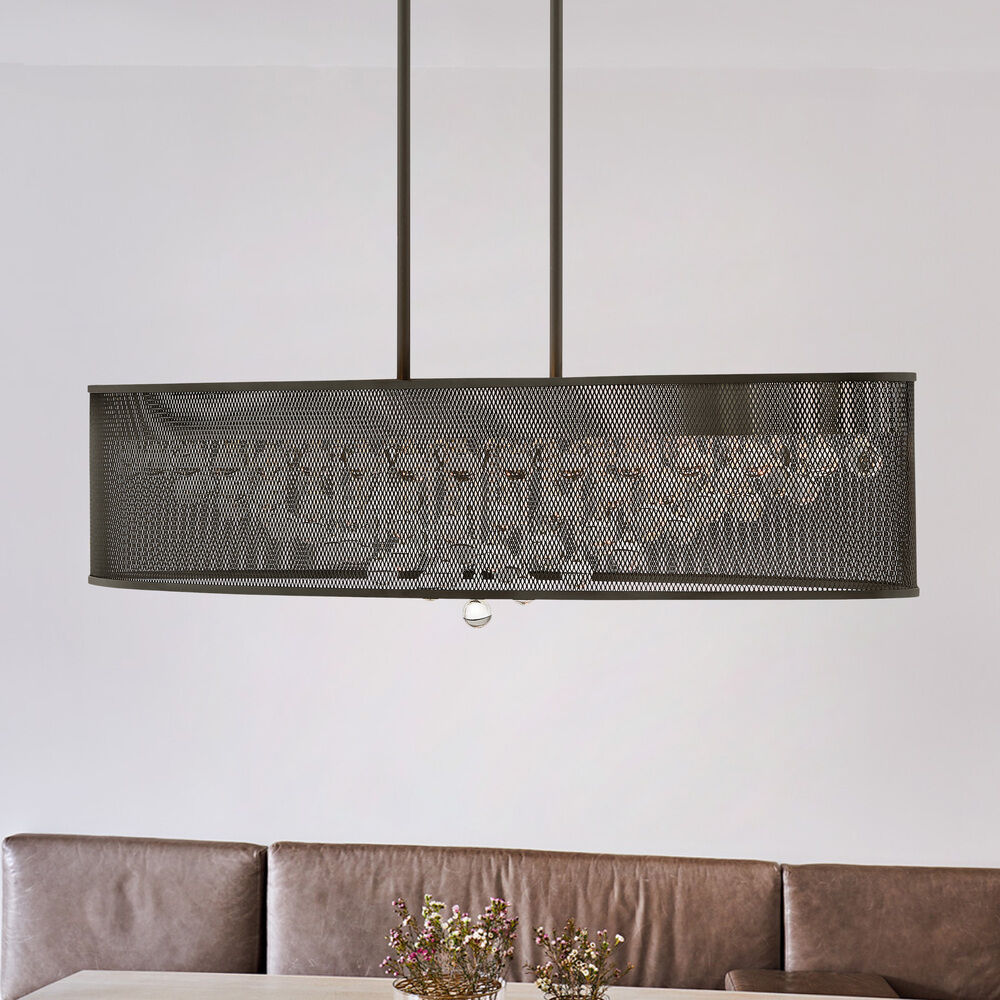 Fiona features a sleek industrial Black mesh outer drum shade encircling tiered glass spheres for the ultimate pairing of industrial-chic design details.