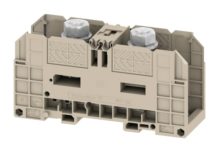 DIN Rail Mount Terminal Block, 2 Positions, 10 AWG, 120 mm², Screw, 269 A This listing is for Each. rohsCompliant: YES Wire Connection Method: Screw hazardous: false rohsPhthalatesCompliant: YES Rated Current: 269 Product Range: WFF Series Conductor Area CSA: 120 usEccn: EAR99 Wire Size AWG Max: 10 No. of Positions: 2 No. of Levels: 1 productTraceability: Yes-Date/Lot Code Wire Size AWG Min: - Rated Voltage: 1 distributorStatus: AUTHORIZED SVHC: No SVHC (16-Jan-2020)