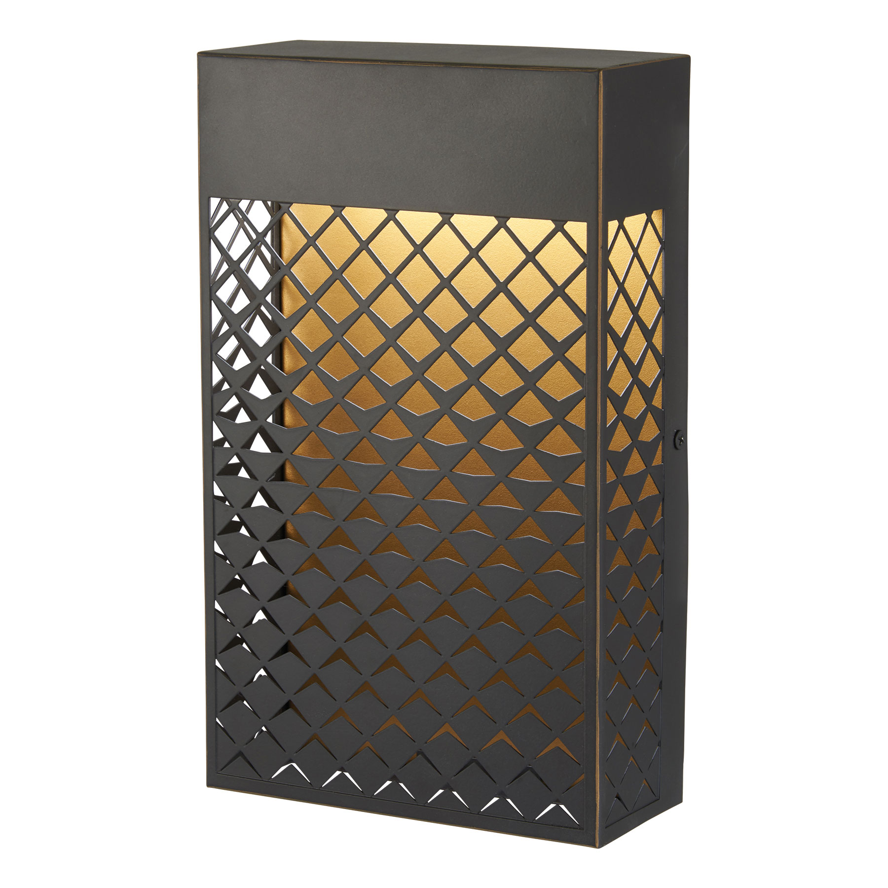 Stunning and radiant, this short outdoor pocket wall light features open geometric details. From Minka Lavery, a rich oil-rubbed bronze finish coats the exterior of the fixture. Matte gold radiates energy-efficient LED light outwards, casting a strikingly warm glow.