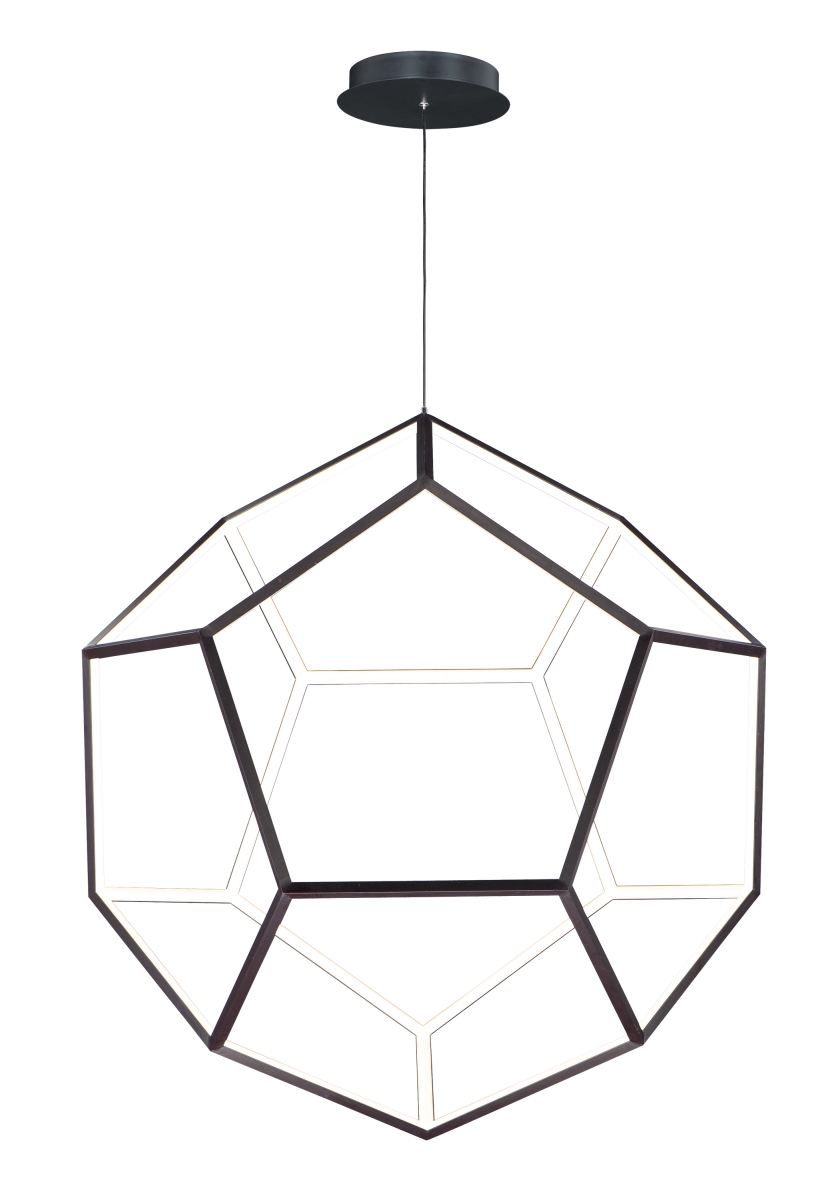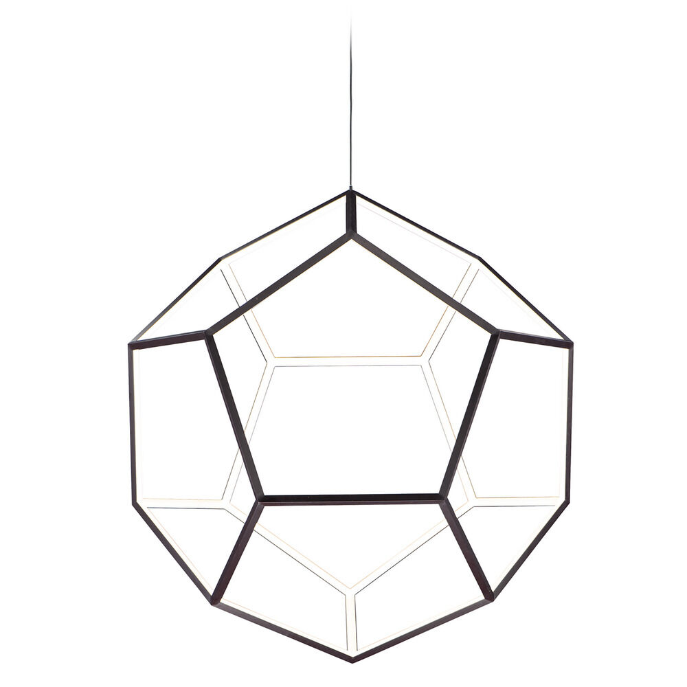 Formed by a series of Black Collectiongons into a spherical shape, this geometric collection is illuminated from the inside for a dramatic lighting effect. Available in 3 sizes ranging from 22" to the dramatic 40" large pendant.<br>LED Pendant<br>Collection: Penta<br>Finish: Black<br>Width: 40"<br>Height: 40"<br>Length: 40"<br>Safety Listing: Dry<br>Bulbs: 1 X PCB 108W 8640lm, Included