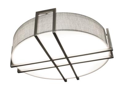 - Flush Mount features ornamental metal accents and a grey linen fabric side diffuser. White bottom acrylic diffuser.