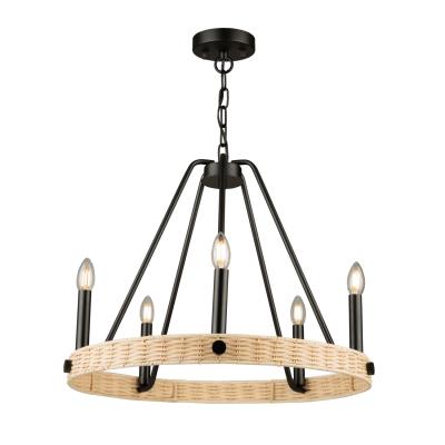 (AC11715BK) Traditional Style Perris Collection 5 Light Chandelier In Black. Handmade rattan shades complimented by black classic frames makes the Perris collection a definite décor trend. This series is available in multiple sizes and in a circular or square type design. Lifetime warranty on electrical components, 5 Year warranty on LED components and finish. Dimmable, sloped ceiling compatible, adjustable height. UL Listed, EZ-Link Smart Device compatible. Indoor/Dry. Light Bulb Data: 5 E12 60 Watt. Bulb Included: No.