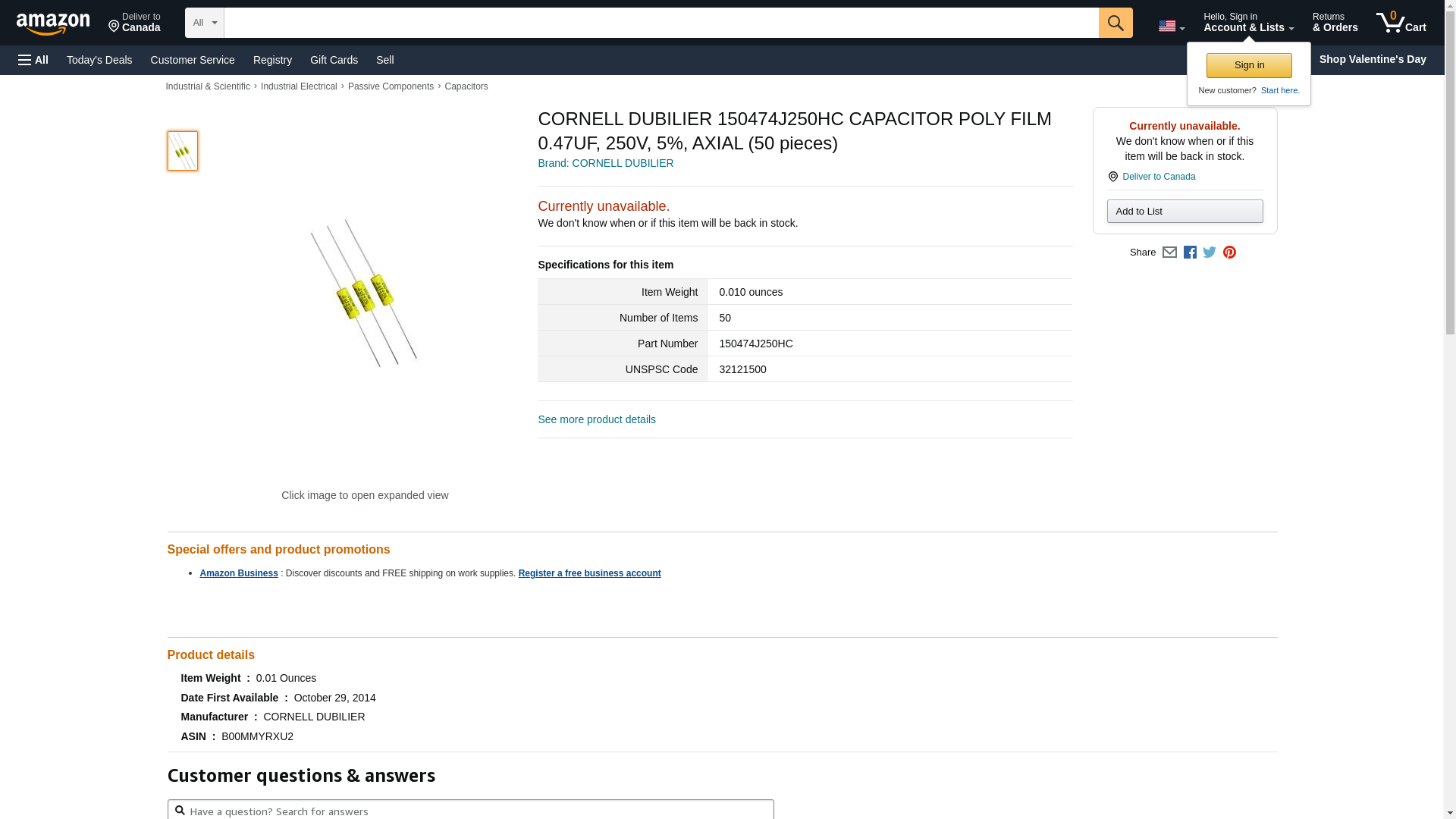 | Feature | CORNELL DUBILIER 150474J250HC CAPACITOR POLY FILM 0.47UF, 250V, 5%, AXIAL |