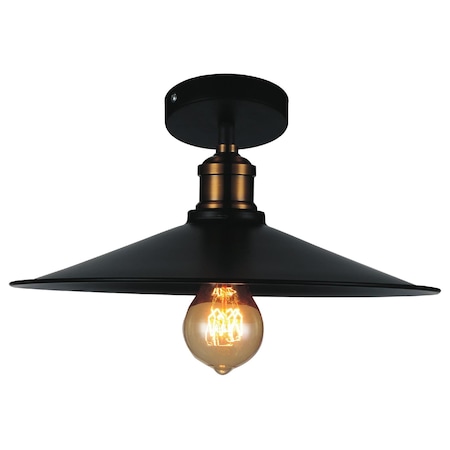 Ready to infuse a sleek yet industrial look to your space is the Brave 1 Light Flush Mount. This black and brass lighting requires an E26 Edison bulb to accurately depict a rustic, vintage flair. The cone-shaped shade has a flared edge and a flatter silhouette to ensure that the exposed bulb will also garner attention. This 13 inch wide light source is perfect for areas with low ceilings and narrow spaces like hallways in need of task and accent lighting. Lighting is jewelry for the home, and there is the perfect piece for every room. This fixture is done in a beautiful black finish which could be the missing piece to lighten up and fall in love with your space all over again.<br/><br/>Features :<br/><br/>- Feel confident with your purchase and rest assured. This fixture comes with a one year warranty against manufacturers defects to give you piece of mind that your product will be in perfect condition.<br/>- Dimensions: H 7" x W 13" x L 13"<br/>- Black Finish - E26 Bulb Not Included - Indoor (Dry Location)<br/>- cETLus Approved<br/>- Includes Assembly Instructions and Hardware<br/>- Compatible With Standard Low Voltage Dimmer.<br/><br/>Specifications :<br/><br/>- Number of Lights : 1<br/>- Voltage : 120v<br/>- Bulb Type : E26<br/>- Warranty Description : One year warranty against manufacturers defect<br/>- Installation Type : Hardwired<br/>- Material : Metal.